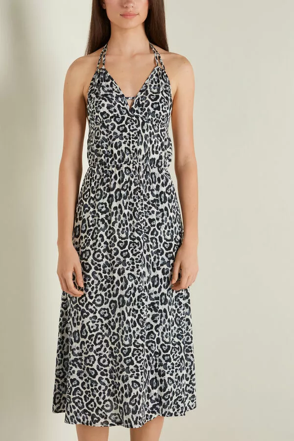 Midi dress in viscose cloth with side slit, triangle cups, and adjustable double straps at the neck and back. Elastic waist.