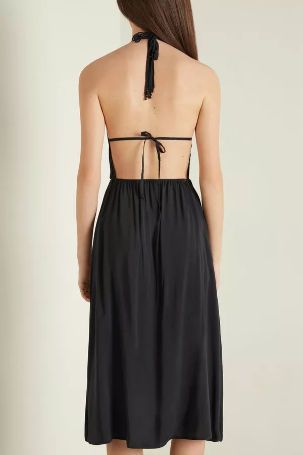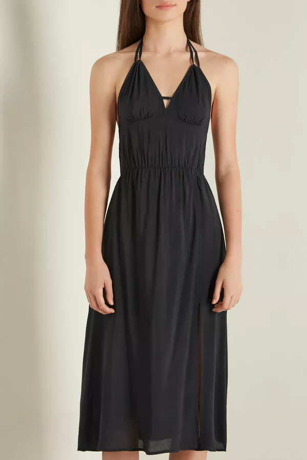 Midi dress in viscose cloth with side slit, triangle cups, and adjustable double straps at the neck and back. Elastic waist.