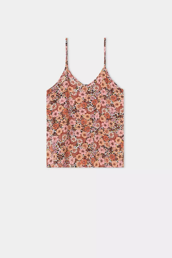 Tank top made of viscose fabric with slightly flared cut, V-neck and thin straps.